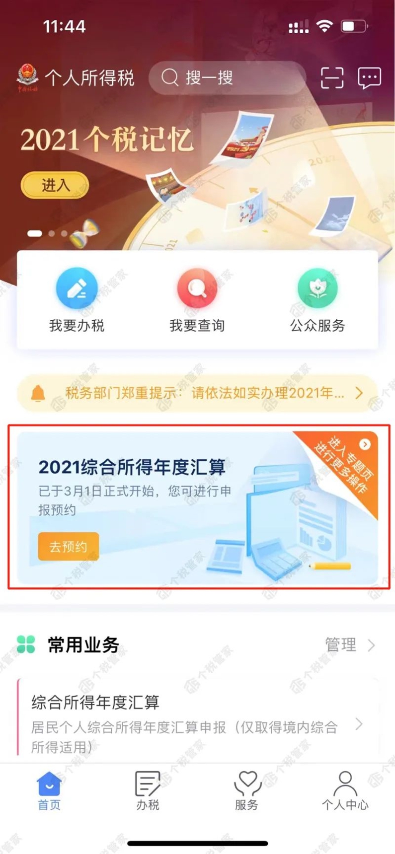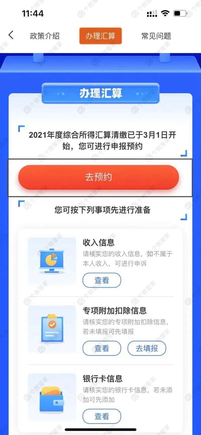 1. 登录个税APP首页,选择【2021综合所得年度汇算】--【去预约】。