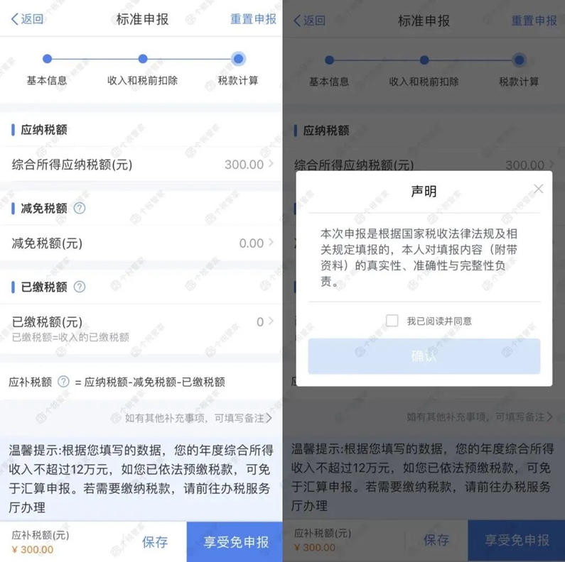 7.如果在标准申报页面,提示有应补税额,在年收入不足12万元或者补税金额≤400元的情况下,可以点【享受免申报】。