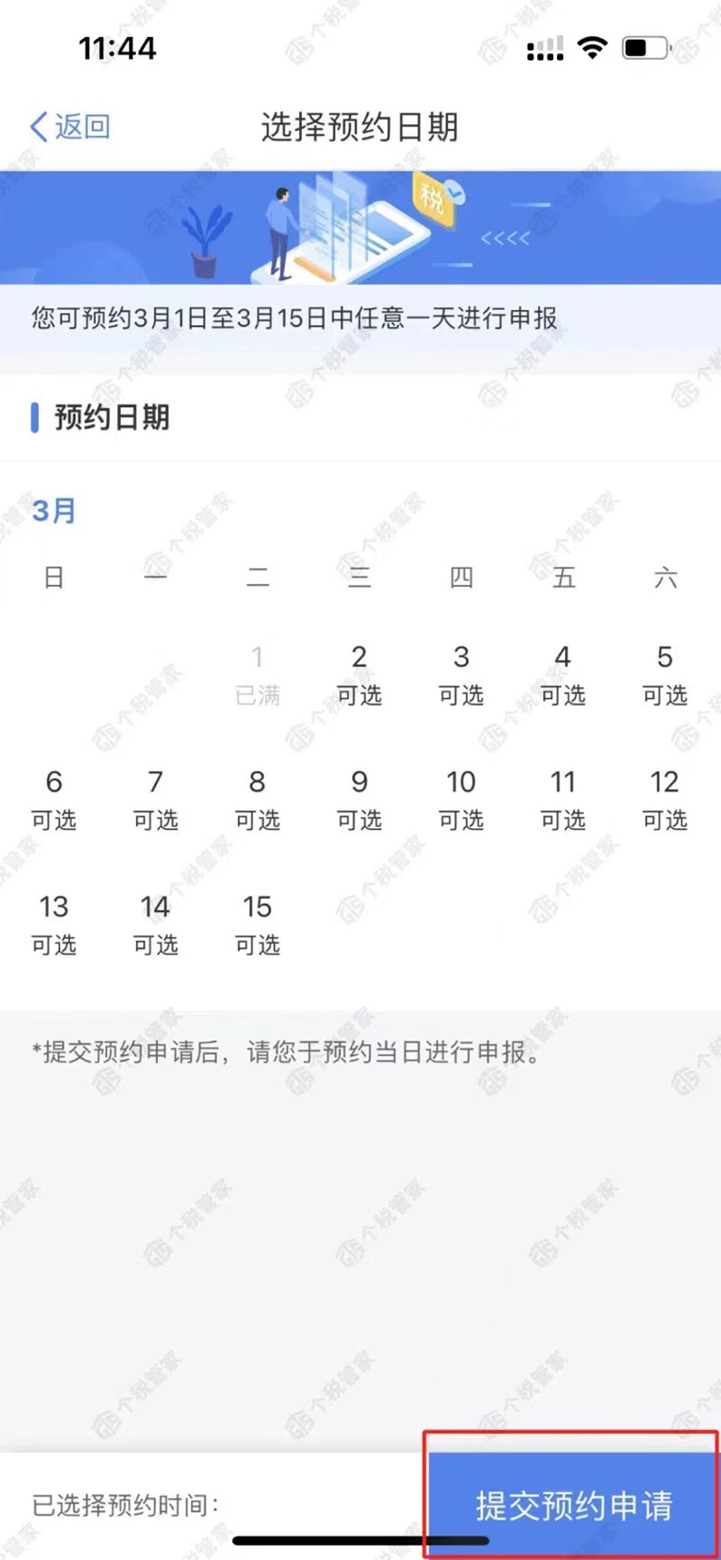 2.选择日期,提交预约申请,即可预约成功。