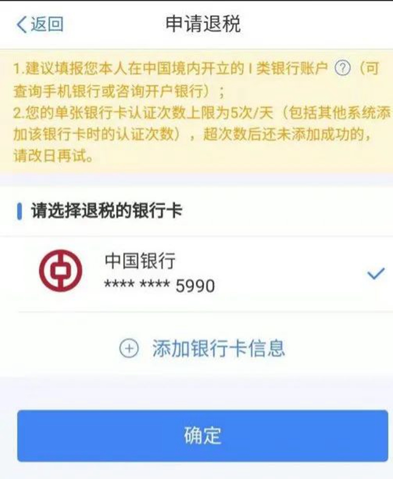 6.最后选“下一步”--“申请退税”--“确定”--“选择银行卡”--“完成”。
